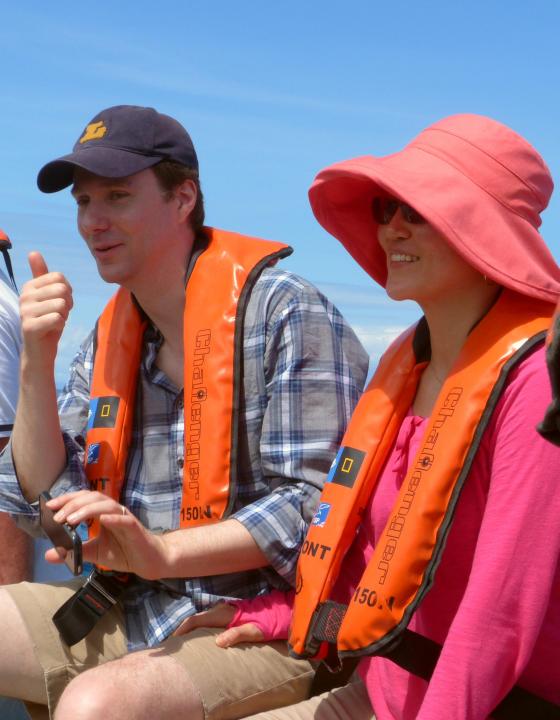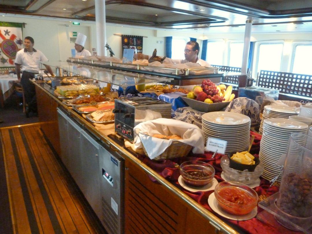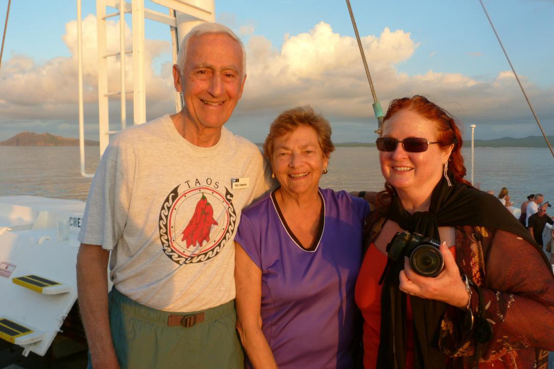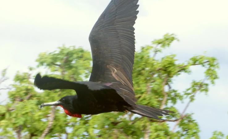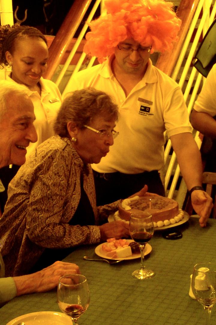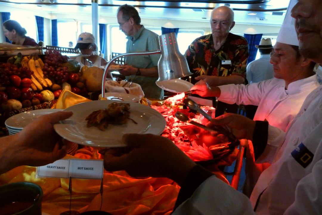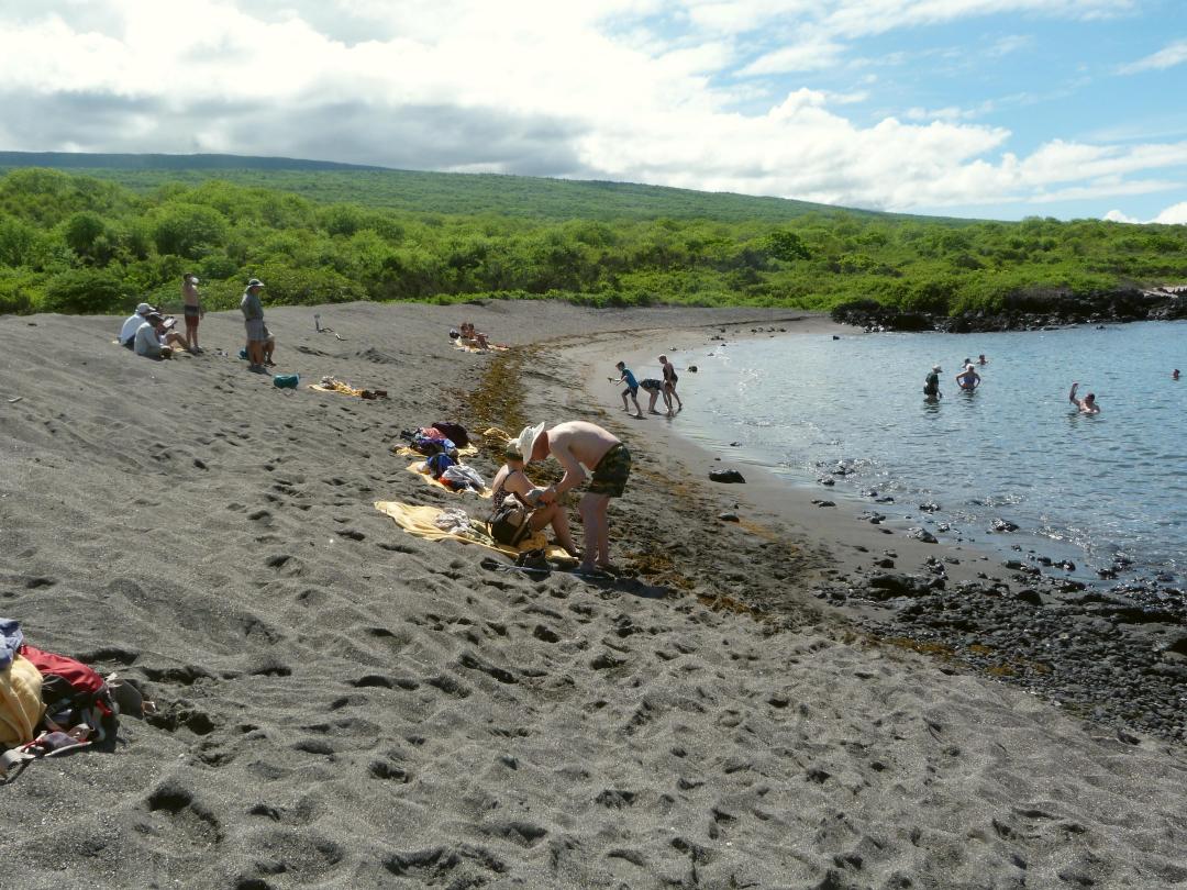Weds. 15 Feb. 2012: Santiago Island. Prebreakfast walk from Playa Espumilla through large trees with very tame birds. Glass bottom boat trip near Buccaneer Cove. Afternoon: fine snorkeling from a lovely beach at Puerto Egas (sea lions, sharks, sea turtles). Evening: BBQ on deck; we sat at the table of the "birthday girl."