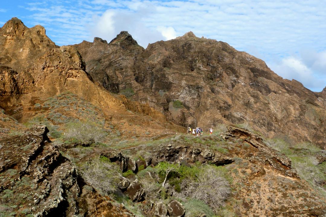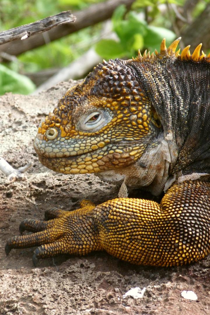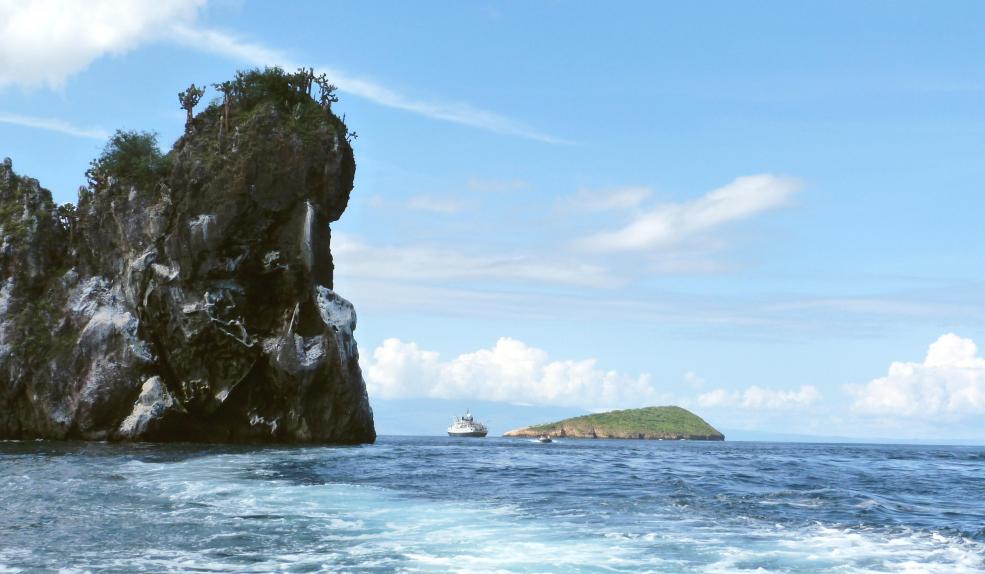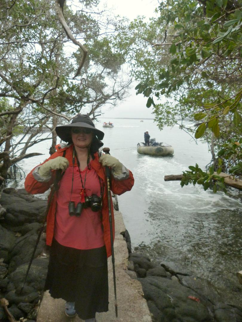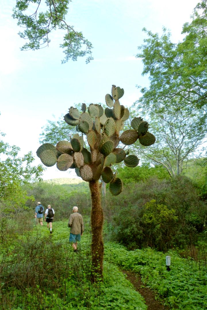 We arrived at the Hilton Colona hotel in Guayaquil after midnight, due to delays in Miami, and had to be up for breakfast by 6 a.m. in order to catch the group flight to Baltra in the Galapagos. Our tour of the islands was on the National Geographic Endeavour, along with 84 other passengers and a crew of about 70. Our cabin had twin beds and was on the uppermost deck with living quarters (there were two decks above ours, with lounge, bar, fitness room, swimming pool, library, etc.). Carlos Romero was the expedition leader, announcing times to disembark for a hike, snorkeling trip, or whatever, and leading an evening recapitulation of the day's activities and a preview of the next day's activities. There were about seven naturalists on board, welleducated and personable Ecuadorians. They led groups of 15 or less (by national park rules) on the various activities. (The Ecuadorian government is becoming more and more strict concerning the number of tourists who visit the islands so as to preserve the vegetation and wildlife. This was important for us to find out and we applaud their approach.) We took zodiacs from the ship to the shore, prepared for either dry landings or wet landings...always outfitted with lifevests.