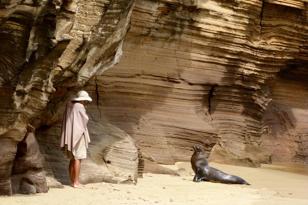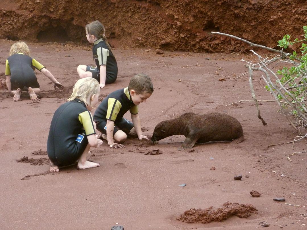 The weather was generally beautiful and the water temperature was perfect. There was only one rainy afternoon. We were in "civilization" on one day (not counting the airport arrivals and departure), when we visited the Charles Darwin Research Station in the largest settlement in the Galapagos. Otherwise, we were in totally wild country (or in the water) with the extremely tame animals. We both took lots of photos with our cameras, and a few underwater shots with an underwater camera. We got to meet a number of the other passengers. There was a "small world" phenomenon: a family of three was also from Nederland, Colorado (we didn't know them before), and a family of four included a planetary scientist who works at JPL. Here briefly is our itinerary in the islands: