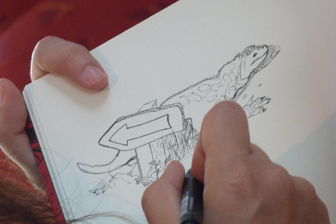 The bridetobe (Skye) sketching the iguana going the wrong way