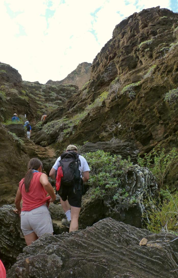 Fri. 17 Feb. 2012: San Cristobal Island. Morning hike 1/3rd of the way up picturesque Punta Pitt to see nesting redfooted boobies and great scenery, followed by cooloff swim and neighboring sea lion. Early afternoon: Y's massage. Later afternoon: snorkeling around Kicker Rock and through channel between two parts of the spectacular rock. Then champagne toast as ship circled Kicker Rock, followed by Captain's farewell cocktail. (We chose not to go into the town capitol of Galapagos in the evening.)