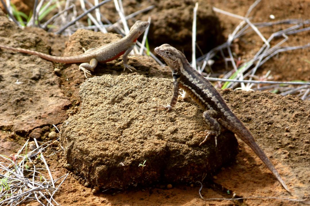 Male land iguana reaches arm through hole in screen toward female in adjacent pen