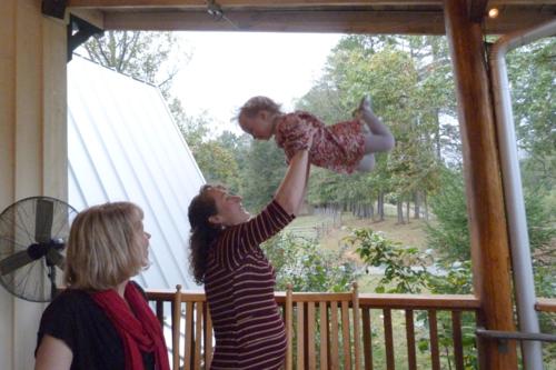 Niece Bonnie lifts granddaughter Camille in the air during reception.