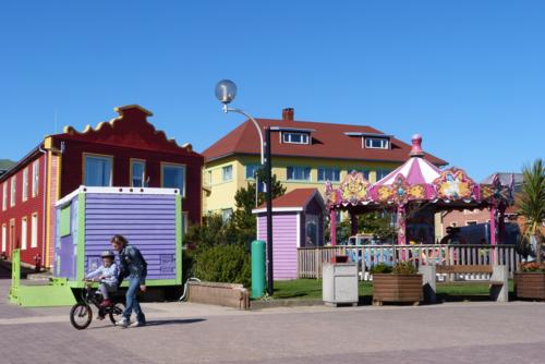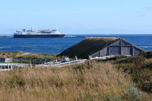 Recreation of Viking village with Natl. Geo. Explorer in background.
