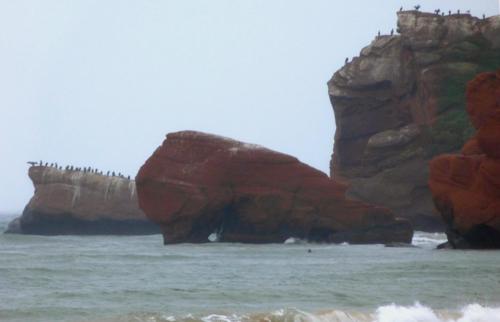 Cormorants spreading their wings atop red cliffs on Iles delaMadaleine, Quebec.